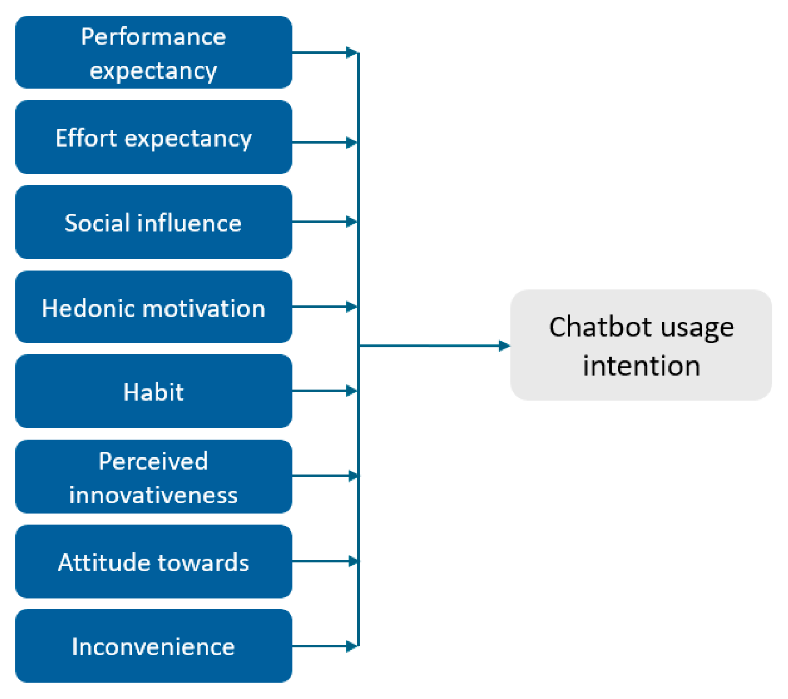 - Attitude towards: The way individuals feel about technology is crucial in shaping their intention to use it and their actual usage patterns. A favorable outlook on technology boosts the chances of its acceptance and utilization, as it has a direct impact on behavioral intention (Venkatesh et al., 2012). In the realm of tourism, having a positive outlook on AI technologies, like chatbots, is essential for improving customer interaction. The way tourists view the simplicity, practicality, and emotional satisfaction of these technologies influences their overall attitudes towards them. If a tourist finds a chatbot easy to engage with and sees it as useful for booking or obtaining information, they will probably have a more favorable attitude.