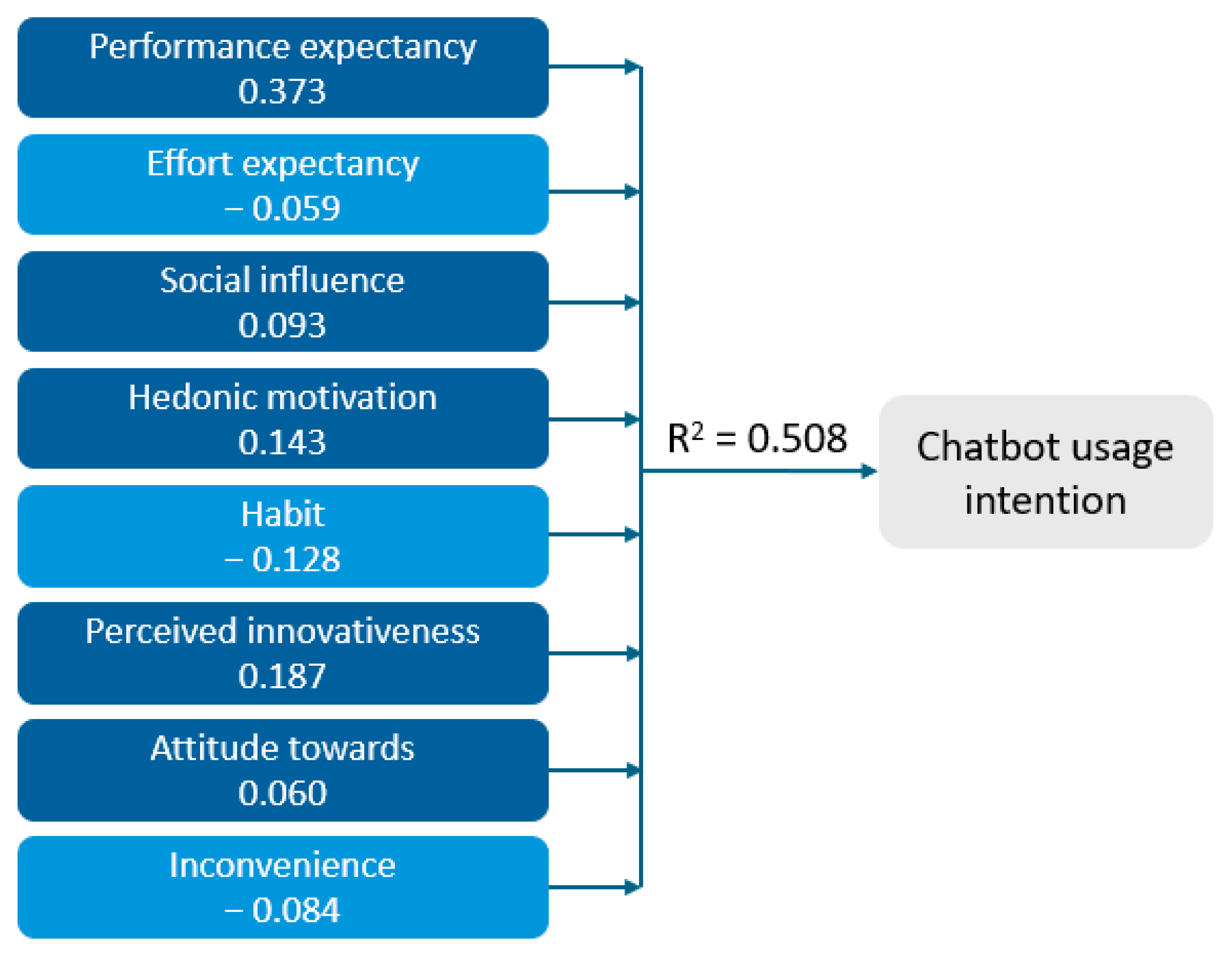 - Inconvenience (INC) has a negative impact on intention to use (β = −0.092, p = 0.268), even though this effect is not statistically important in this model, implying the need for enhancement in the accessibility and usability of chatbots.