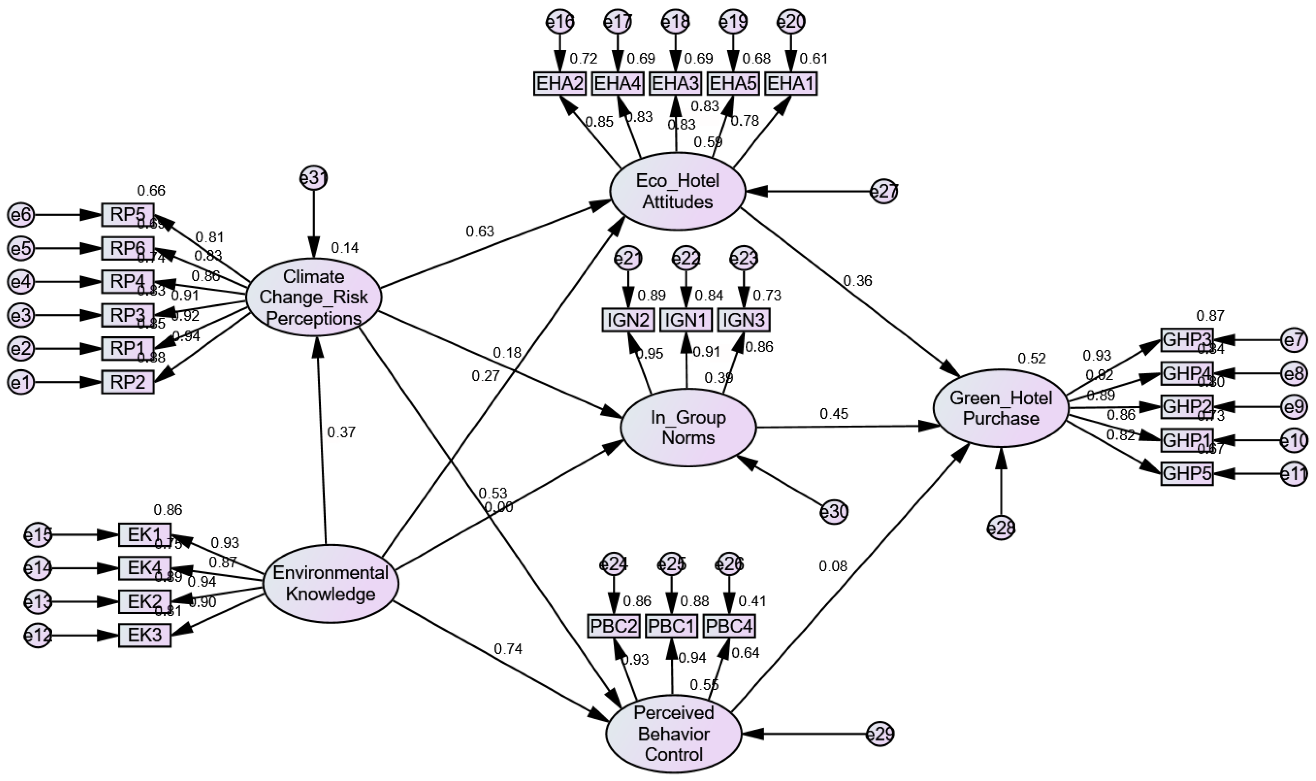 Squared Multiple Correlations (R2): Climate Change-Related Risk Perceptions = 0.135; Eco-Hotel Attitudes = 0.582; In-Group Norms = 0.387; Perceived Behavioral Control = 0.547; Green Hotel Purchase Intentions = 0.516. |