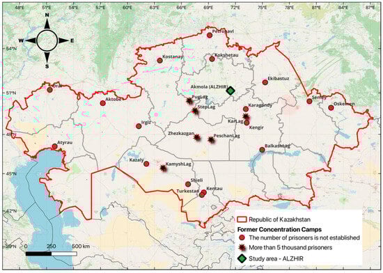 Map of Kazakhstan with indicated gulag areas and indicated case study area ALZHIR.