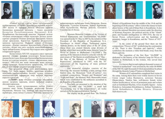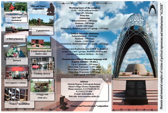 The ALZHIR museum explicitly presents itself through dual roles: educational and commemorative. Archival marketing materials such as brochures and leaflets consistently emphasize both the historical context and educational value of the site (Figure 2). For instance, specific exhibits, including the “Wall of Memory,” the “Train Carriage from Stalin’s time,” and various sculptures such as “Despair and Powerlessness,” are described in ways intended to evoke emotional engagement and reflection. These materials underscore ALZHIR’s purpose as a place of memory and preservation of victims’ stories, consistently reinforcing the museum’s commemorative role. However, despite the documented multi-ethnic composition of prisoners (see Table 1), ALZHIR’s marketing materials tend to focus more heavily on generalized victimhood or national unity rather than explicitly highlighting ethnic diversity. The emphasis on Kazakh resilience and feminine suffering sometimes eclipses the narratives of minority and foreign prisoners. This selective representation could influence how visitors perceive the camp’s historical inclusivity, potentially narrowing the scope of commemoration to more dominant identities.