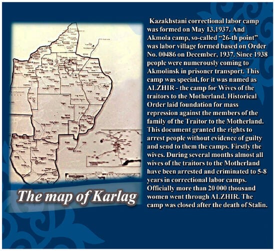 - Kukushkina, A. (2003). Akmola camp of wives of “Traitors to the Motherland”: History and Destinies. Available online: https://csmb.kz/images/csmbkz/ocyfrovannye/aqmol.pdf (accessed on 12 May 2024).