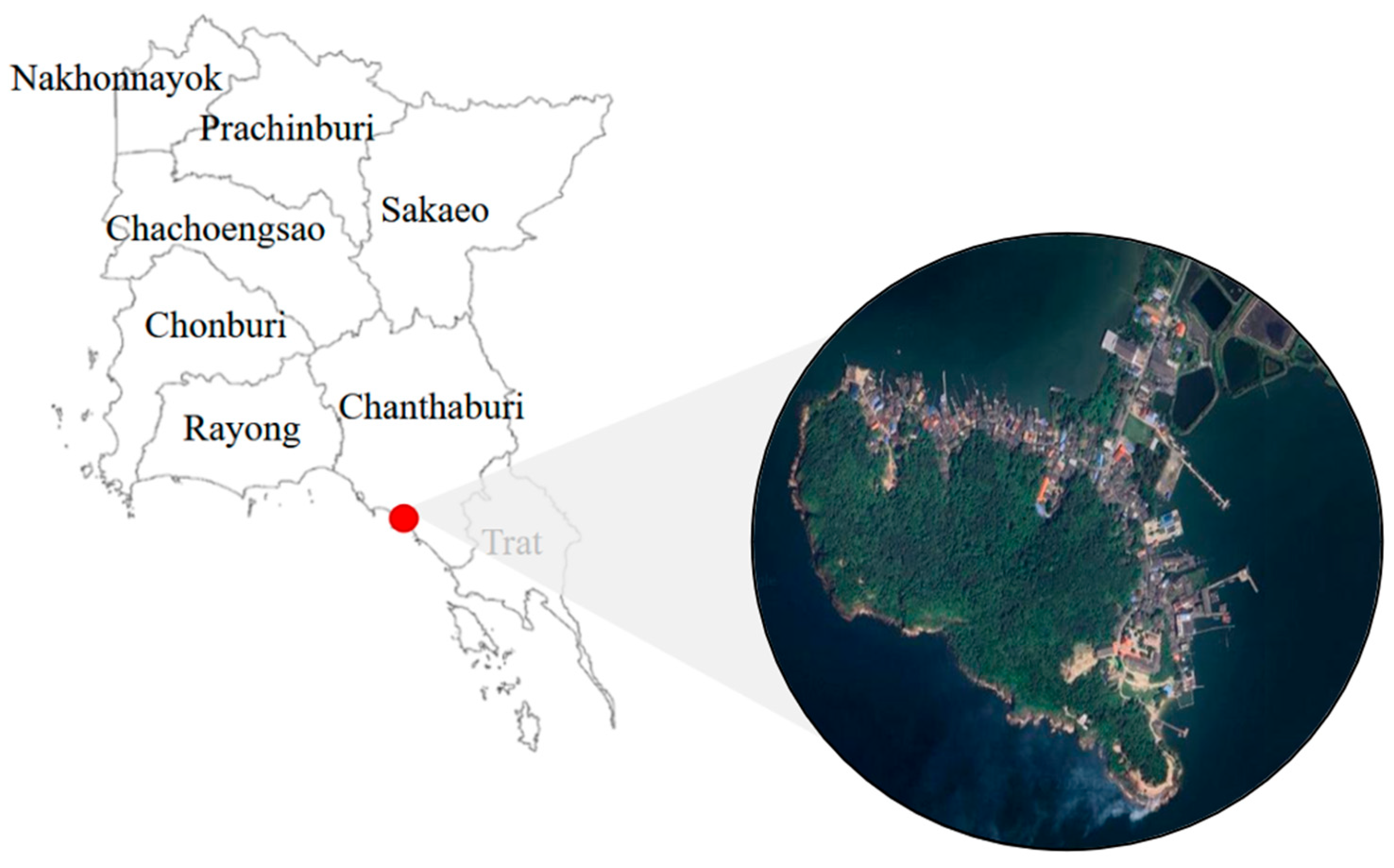 - Google Earth. (n.d.). [Screenshot of Koh Perd, Koh Perd subdistrict, Laem Sing district, Chanthaburi, Thailand on Google Earth] [Map]. Google Earth. Available online: https://www.google.com/maps/place/%E0%B9%80%E0%B8%81%E0%B8%B2%E0%B8%B0%E0%B9%80%E0%B8%9B%E0%B8%A3%E0%B8%B4%E0%B8%94+%E0%B8%95%E0%B8%B3%E0%B8%9A%E0%B8%A5+%E0%B9%80%E0%B8%81%E0%B8%B2%E0%B8%B0%E0%B9%80%E0%B8%9B%E0%B8%A3%E0%B8%B4%E0%B8%94+%E0%B8%AD%E0%B8%B3%E0%B9%80%E0%B8%A0%E0%B8%AD+%E0%B9%81%E0%B8%AB%E0%B8%A5%E0%B8%A1%E0%B8%AA%E0%B8%B4%E0%B8%87%E0%B8%AB%E0%B9%8C+%E0%B8%88%E0%B8%B1%E0%B8%99%E0%B8%97%E0%B8%9A%E0%B8%B8%E0%B8%A3%E0%B8%B5/@12.4092091,102.1250228,1473m/data=!3m1!1e3!4m6!3m5!1s0x3104797e8698f5d5:0x6586d2c04780b9ea!8m2!3d12.4062629!4d102.1604131!16s%2Fg%2F11twdqtcp0?authuser=0&entry=ttu&g_ep=EgoyMDI1MTAyMC4wIKXMDSoASAFQAw%3D%3D (accessed on 24 October 2025).