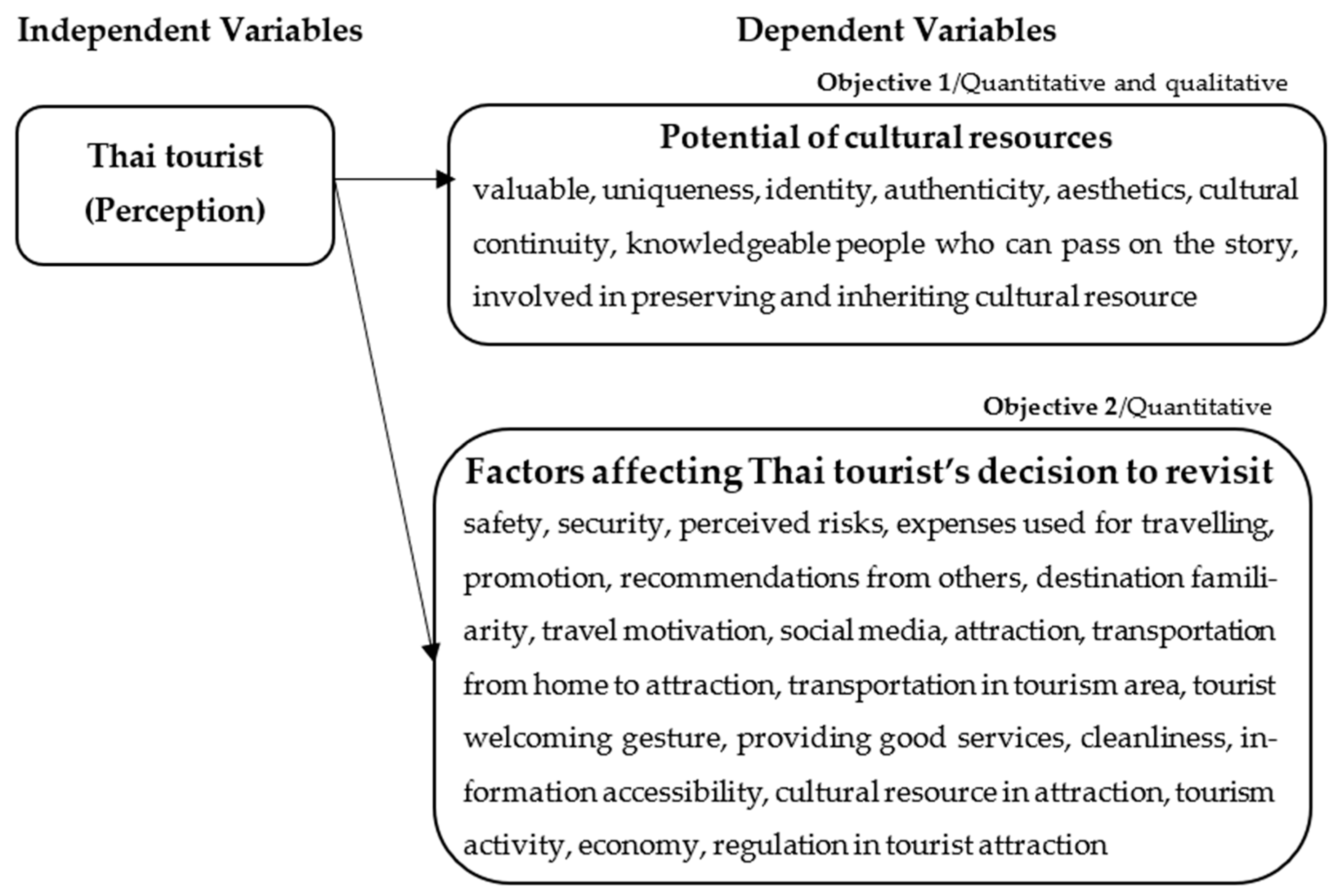 | 2. To study factors affecting Thai tourist’s decision to revisit Koh Perd Fishing village | Quantitative | 400 Samples | Purposive Sampling (Thai tourist visiting Koh Perd) | EFA, CFA, Multiple Regression |