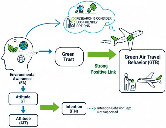 Green Trust (GT) itself is considered a crucial driver of Green Air Travel Behavior (GTB), mediating the relationship between environmental perception and actual behavioral outcomes (). In addition, Attitude (ATT) and Behavioral Intention (ITN) core TPB components are posited to directly influence GTB, in line with the theoretical expectation that favorable attitudes and strong intentions lead to action (; ).