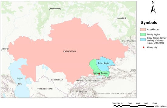 This study employed a qualitative comparative cross-sectional design with two independent waves of empirical data collection: in 2018 and in 2024. This design allows us to compare stakeholders’ perceptions at two points in time without assuming continuity between them. The focus was on Almaty city and Almaty region as interconnected but distinct contexts of tourism governance. A map of the study area is presented in Figure 1.