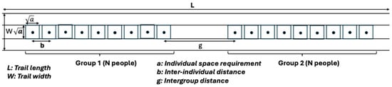 According to this framework, an ideal hiking group consists of 9 individuals (N), with an inter-personal spacing of 2 m (b) and a minimum spacing of 50 m between groups (g). These parameters are used to calculate the maximum number of hikers that can be accommodated on a trail while maintaining social comfort standards as described in Figure 2. This value is then used to derive the social correction factor using the following formula: