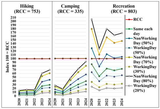 Comparison of RCC scenarios with annual average daily visitation for Hiking, Camping, and Recreation (2020–2024).