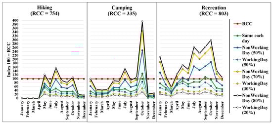 Seasonality is even more pronounced for Camping. October emerges as a critical hotspot, with daily visits on non-working days exceeding the RCC (335 persons/day) across all scenarios. July is another pressure point, reaching 133% of RCC in Scenario 3 and 152% in Scenario 4, whereas January and September only exceed RCC under Scenario 4. Even when social crowding preferences are set aside and only physical space is considered, October is the sole month where the available area per camper falls below the 84 m2 standard: 56 m2, 40 m2, and 35 m2 in scenarios 2, 3, and 4, respectively. These values signal extreme physical congestion during the October peak.