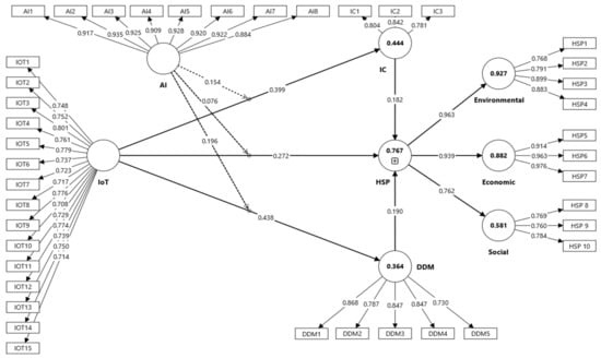 Fifteen items from Gajić et al. (2024) were adapted to measure IoT; sample items include “IoT monitors and optimizes water and resource usage” and “IoT sensors manage food and beverage supplies, reducing waste.” Innovative capabilities were assessed with a three-item scale adapted from Agyapong et al. (2018), such as “Our hotel has the ability to support and drive new ideas and their implementation.” Additionally, eight items from Gajić et al. (2024) measured participants’ perceptions of AI application, for example, “AI algorithms optimize energy, reducing costs and environmental footprint.” DDM was evaluated using a five-item scale from Ashaari et al. (2021), including items such as “Our hotel depends on data-based insights to support decision making.” Finally, a 10-item scale adapted from Abdou et al. (2022a) was used to evaluate the HSP. In this study, HSP was modeled as a second-order construct comprising three dimensions: environmental, economic, and social performance. Sample items include “mitigating climate change and ecological degradation,” “increasing the hotel’s sales volume and profit margin,” and “enhancing the employees’ and customers’ quality of life.”