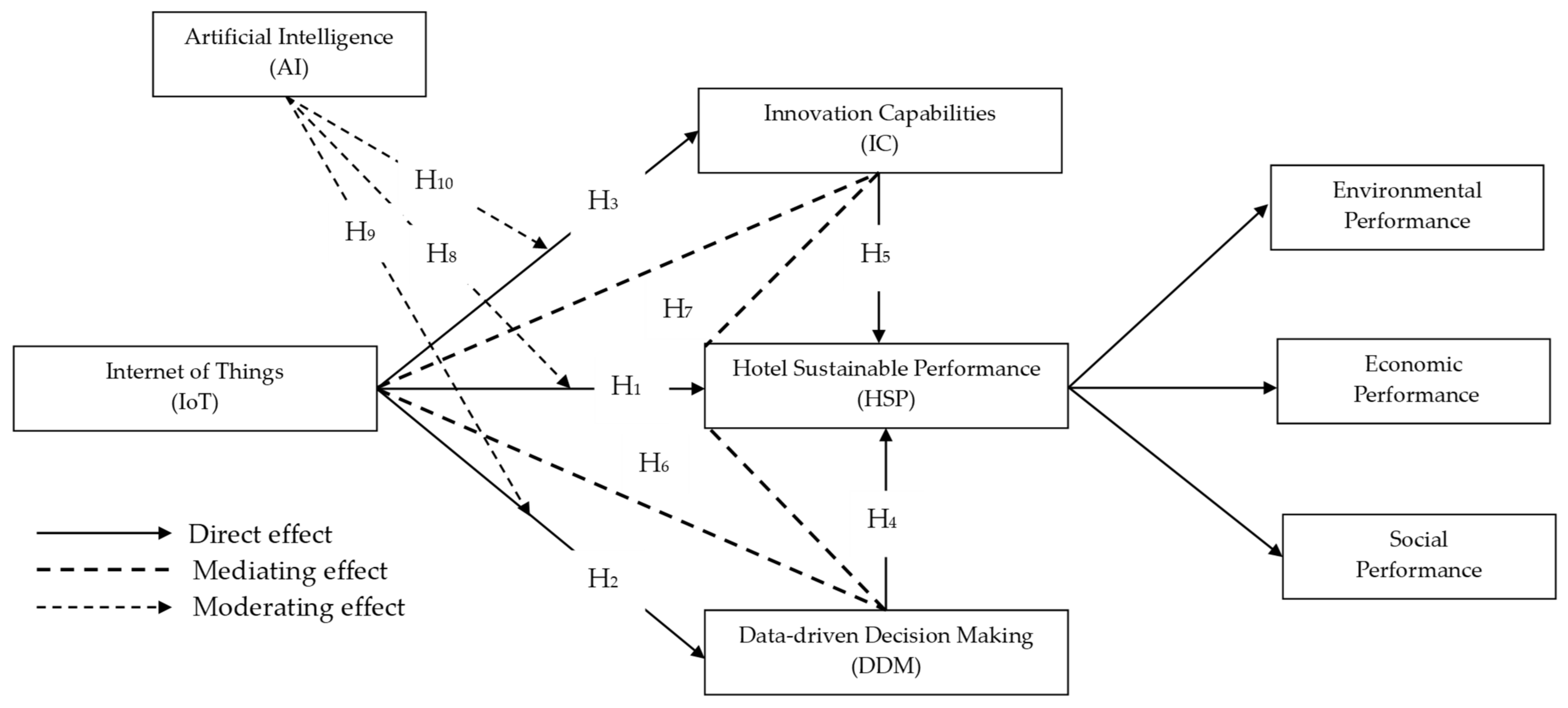 In this study, we propose that the mediating role of DDM in the IoT-sustainable performance relationship is theoretically supported by the Resource-Based View, which regards IoT as a valuable technological resource (Barney, 1991), and Dynamic Capabilities Theory, which explains how data-driven processes enable firms to reconfigure this resource into sustainable performance outcomes (Teece et al., 1997). Specifically, IoT provides hotels with real-time data that can be highly valuable, but it only leads to sustainability when managers know how to use it effectively. By developing DDM skills, managers can analyze and apply this data to conserve resources, reduce inefficiencies, and make smarter choices for both the environment and the business. In this way, DDM becomes the key mechanism for transforming IoT information into actionable practices that may enhance long-term sustainable performance. Thus, based on the above discussion, the following hypothesis is proposed: