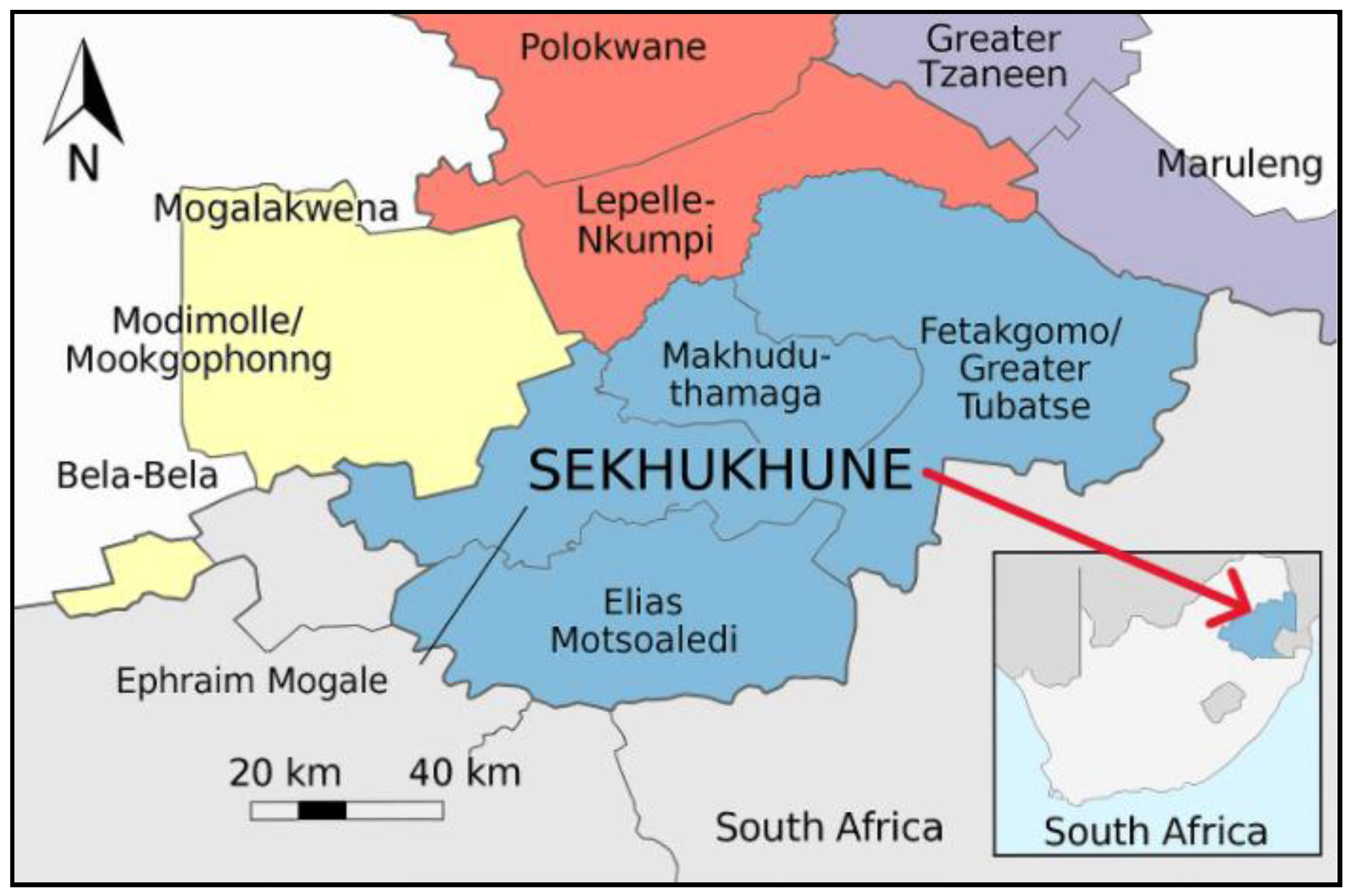 - Google Maps. (2024). Map of sekhukhune district municipality. Available online: https://www.google.com/maps/place/Sekhukhune+District+Municipality (accessed on 22 June 2022).