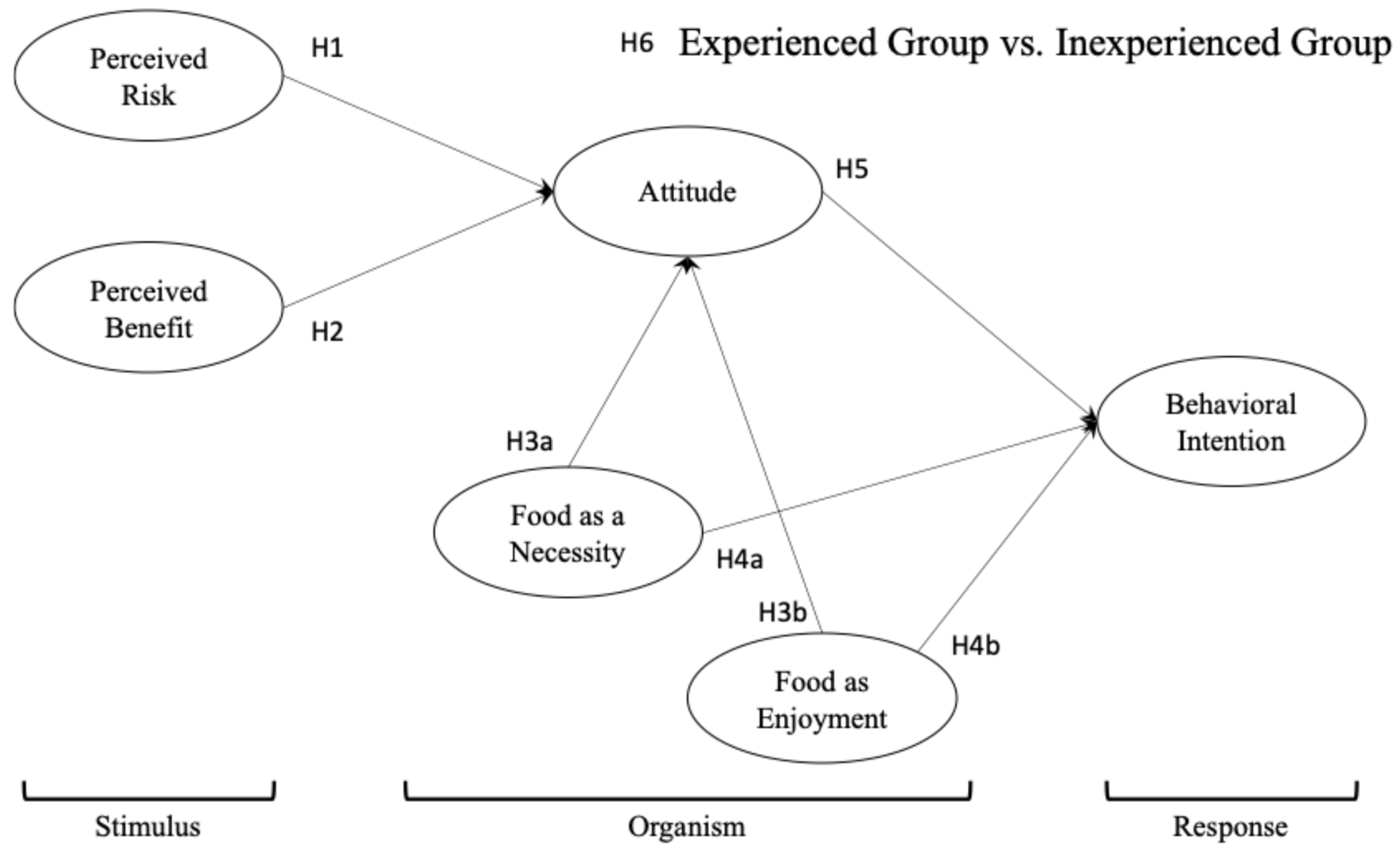 Based on this framework, this study addressed three research objectives. First, it examined how consumers’ stable food consumption needs (necessity vs. enjoyment) influence their situational attitudes and final behavioral intentions. Second, it assessed the role of immediate stimuli (perceived risks and benefits) in shaping consumer attitudes. Finally, this study explored how prior experience moderates these relationships by testing whether the decision-making process differs between new and experienced consumers.
