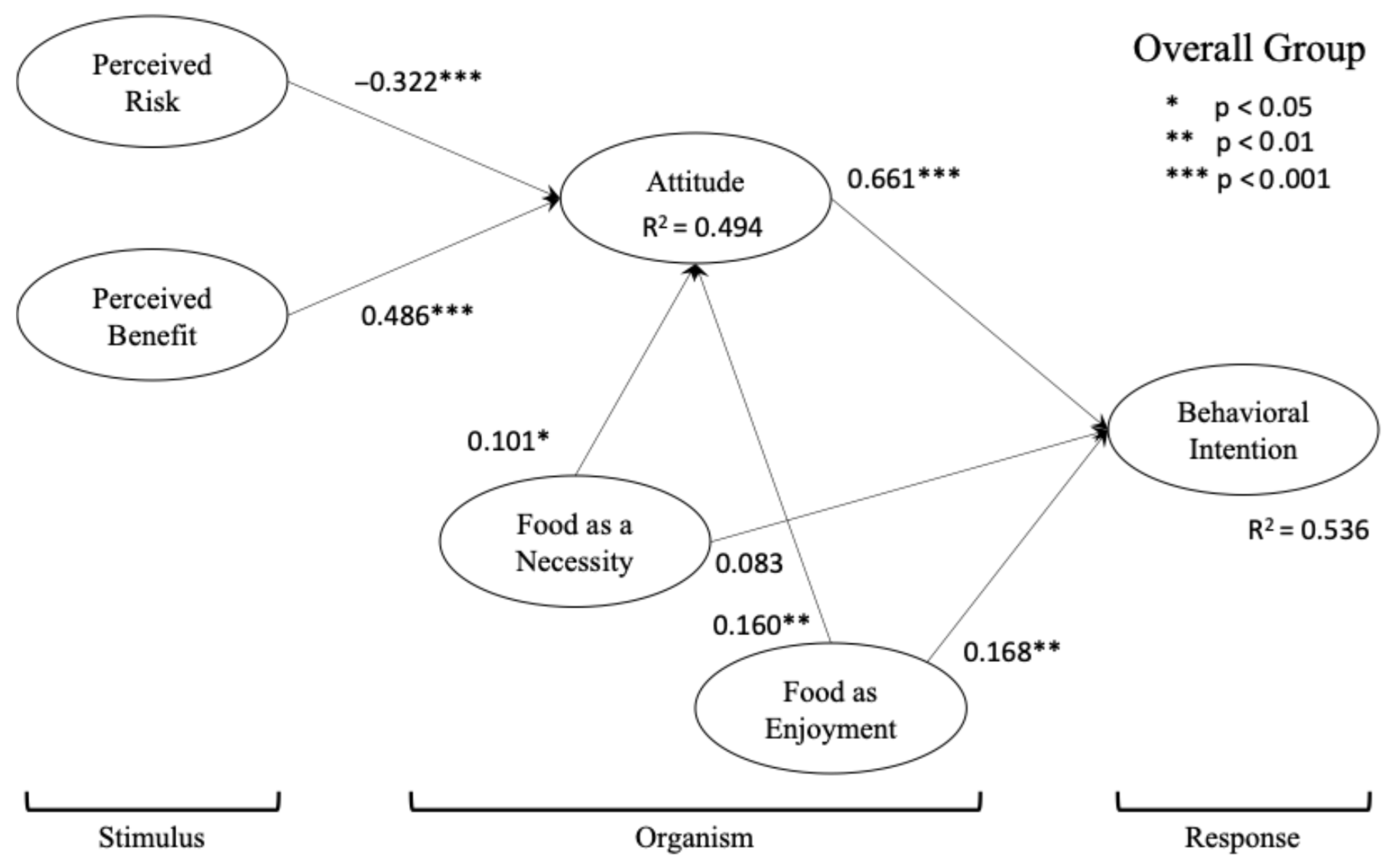 To test the full SOR paths and VAB-based logic, we conducted a formal mediation analysis using the bootstrapping method. The results confirmed that attitude significantly mediated these relationships. The indirect effect of perceived risk on behavioral intention via attitude was significantly negative (β = 0.213, p < 0.001), whereas the indirect effect of perceived benefit on behavioral intention via attitude was significantly positive (β = 0.321, p < 0.001). Food as a necessity (β = 0.067, p < 0.05) and food as enjoyment (β = 0.106, p < 0.01) indirectly affected behavioral intention. These findings support our conceptualization of attitude as the key mechanism through which both external stimuli and internal traits are converted into behavioral intentions.