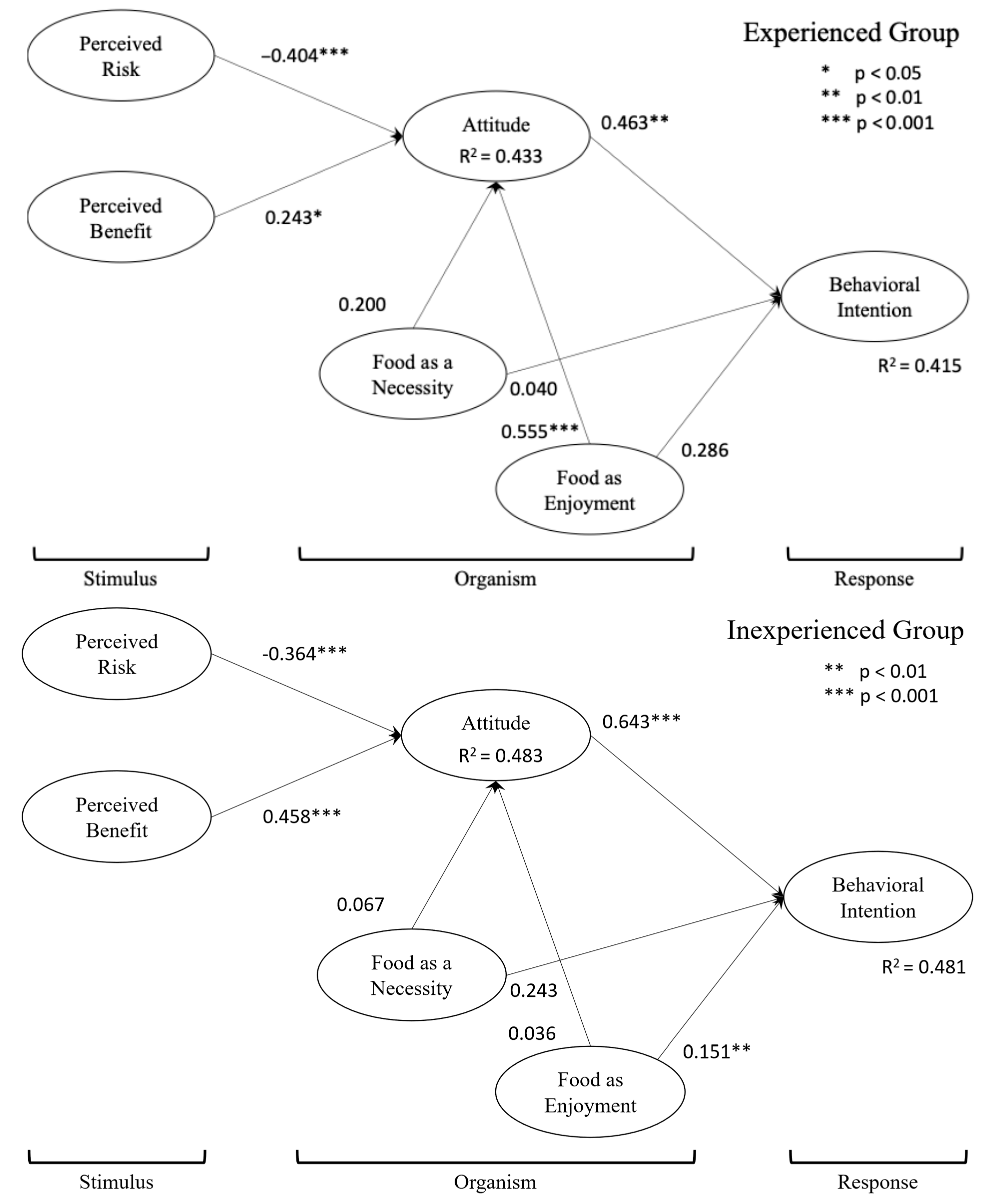 Based on this result, we compared the strength of each relationship between the experienced and inexperienced groups (Figure 3). Out of the seven hypotheses (Table 4), two hypotheses observed significant differences across the two groups: Food as enjoyment → Attitude ( β e x p e r i e n c e d =   0.555 ,     β i n e x p e r i e n c e d =   0.036 ,   χ 1 =   6.663 ,     p   <   0.01 ) and Attitude → Behavioral intention ( β e x p e r i e n c e d =   0.463 ,     β i n e x p e r i e n c e d =   0.643 ,     χ 1 =   3.651 ,     p   <   0.10 ). However, the path from food as enjoyment to behavioral intention was statistically significant only for the inexperienced group ( β i n e x p e r i e n c e d =   0.151 ). An interesting pattern emerged for the role of food as enjoyment. For the experienced group, the relationship between food as enjoyment and attitude was statistically significant. However, for the inexperienced group, the relationship between food enjoyment and attitude was statistically significant for behavioral intention. We also observed a marginally significant difference in the path from attitude to behavioral intention. As suggested by the habit formation framework, this finding provides initial evidence that the relationship between attitude and intention may weaken with increasing the level of experience and habit formation; however, attitude may remain a significant predictor in both groups. The remaining four paths showed no significant differences between the two groups.