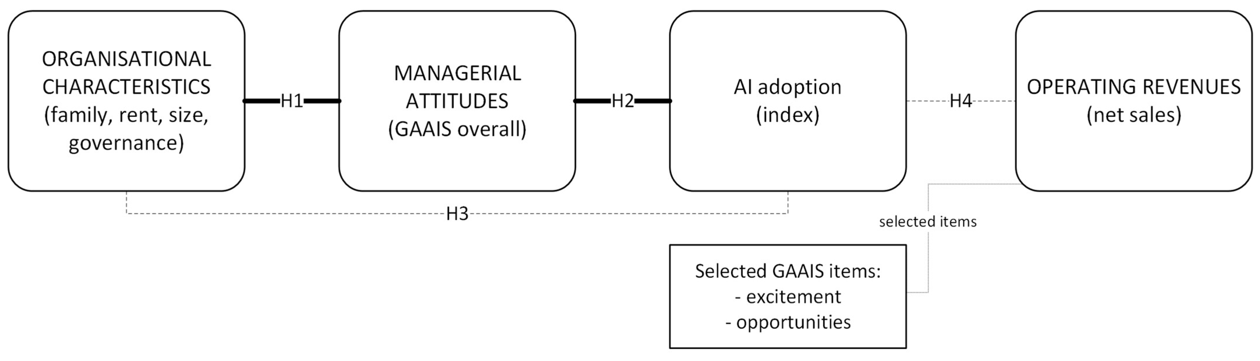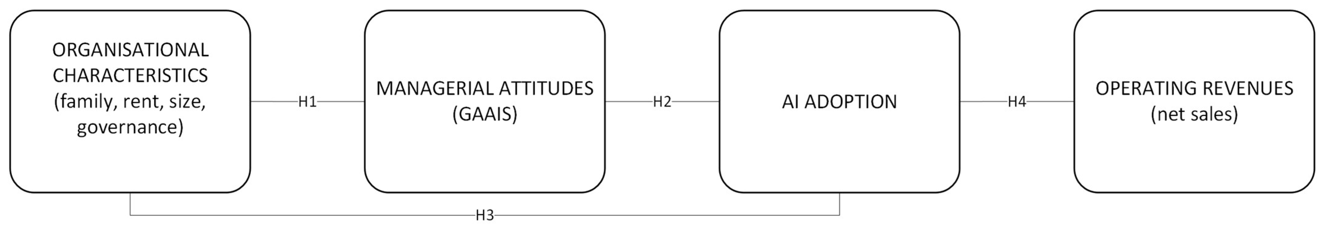 This study examined how organisational characteristics and managerial attitudes shape AI adoption and financial performance among hospitality SMEs in Slovenia, an EU tourism economy dominated by micro and small family firms. The analysis addressed three RQs focused on (1) the role of managerial attitudes, (2) the influence of organisational characteristics, and (3) the link between AI adoption and operating revenues. Four hypotheses (H1–H4) were tested using data from 286 firms.