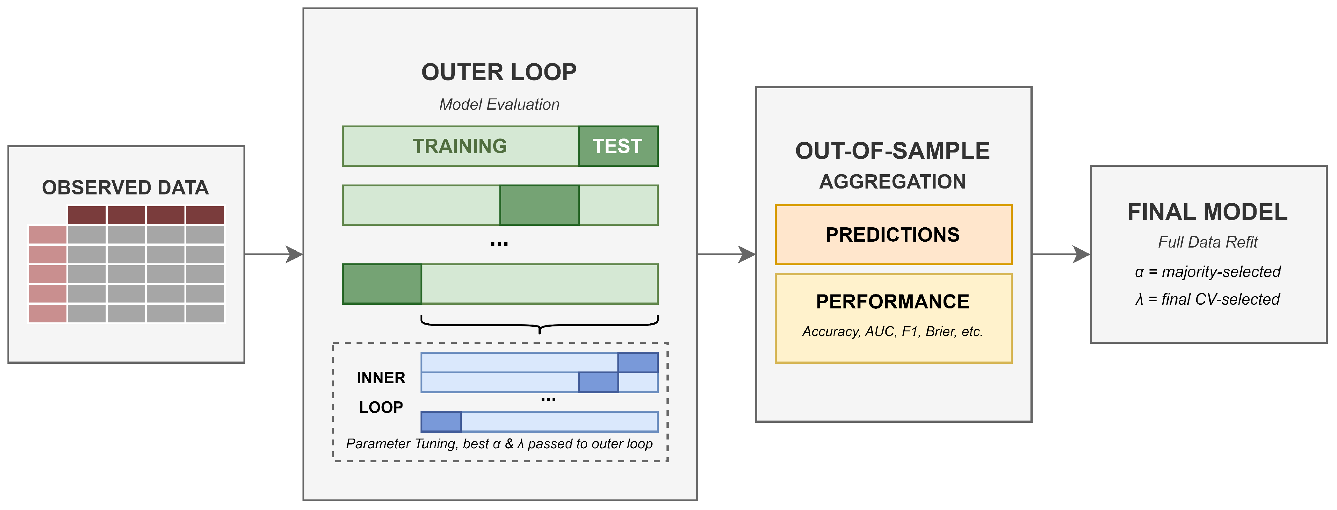 Model tuning and performance evaluation used a nested k-fold CV design to avoid selection bias (Ghasemzadeh et al., 2024; Varma & Simon, 2006; Wainer & Cawley, 2021). The dataset was partitioned into 10 stratified folds, with each fold serving once as the test set while the remainder formed the training set. Within each training set, a 5-fold CV was conducted to compare candidate values of α and to identify the corresponding λ that minimized misclassification error. The selected model was then refit on the outer training data and applied to the unseen test fold. Repeating this process across all folds yielded unbiased out-of-sample (OOS) predictions for every case. Following a nested CV, a final model was estimated on the full dataset for interpretation. The most frequently selected value of α across folds was retained, and a 10-fold CV on the full data identified the final λ . Coefficients for each outcome class were then extracted at the λ 1 S E , and performance metrics were calculated from the aggregated OOS predictions.