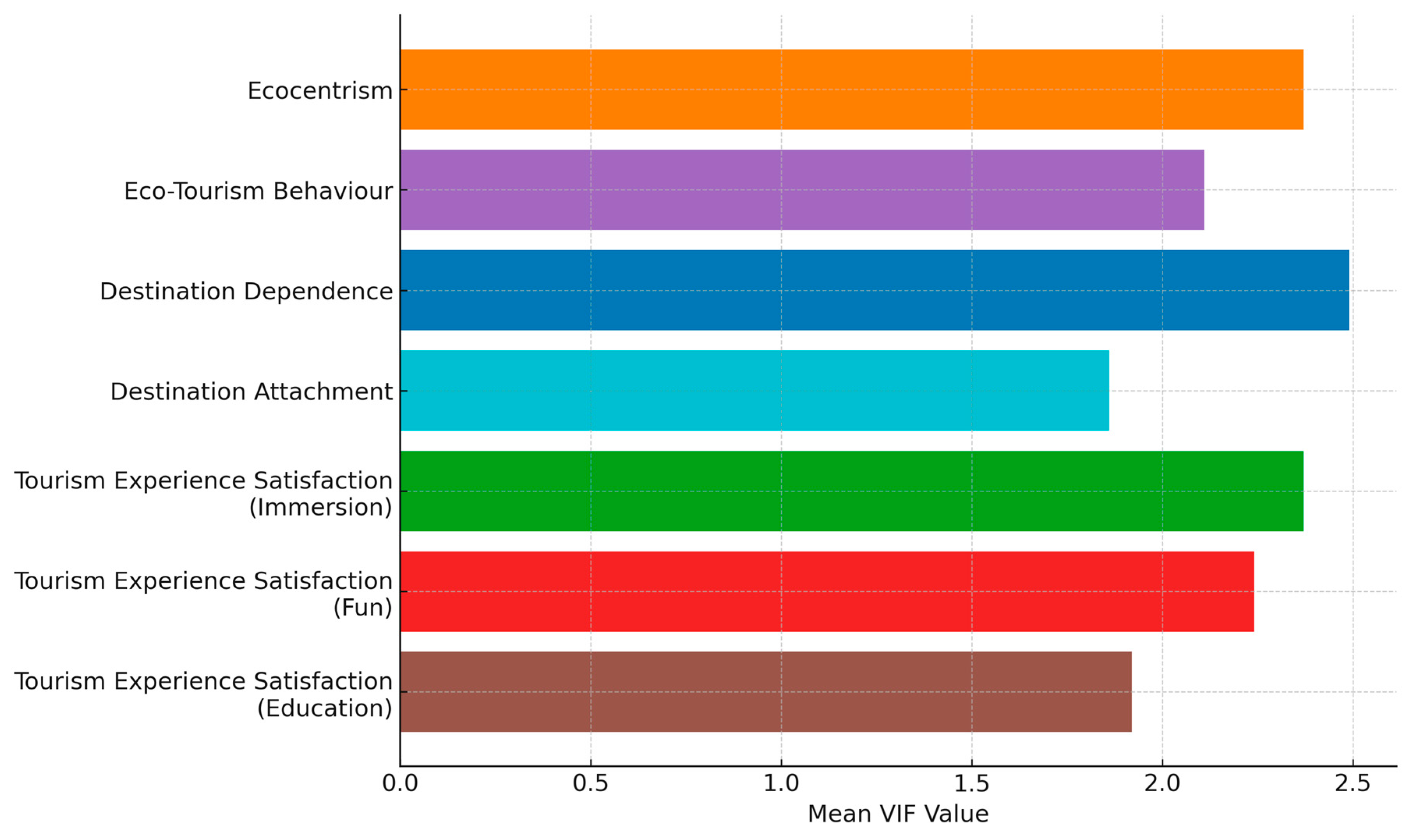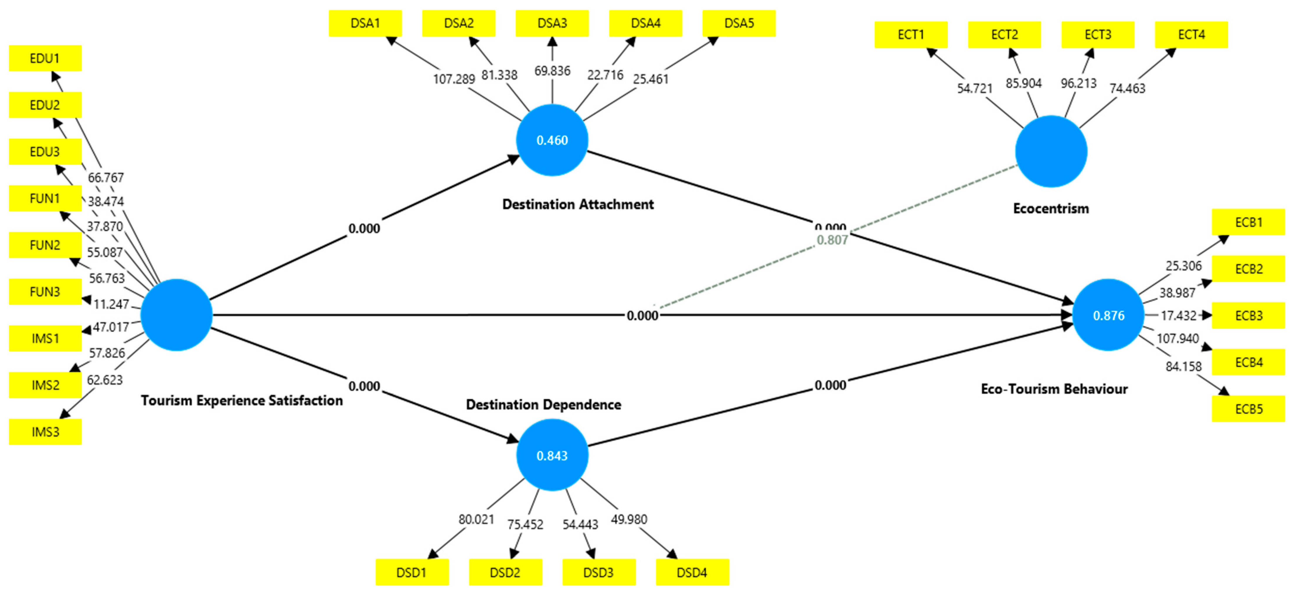 | Destination Attachment | Destination Dependence | Eco-Tourism Behaviour | Ecocentrism | Tourism Experience Satisfaction | |