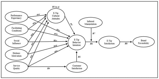 Prior tipping literature primarily examined motives such as service quality and social norms. However, no study has examined these motivations when tipping becomes technologically mediated. E-tipping introduces a new behavioral domain where technology acceptance factors intersect with tipping drivers. Although UTAUT has been widely applied across industries, including mobile and e-payments, no study has used UTAUT in restaurant service settings, nor integrated it with brand favorability as a core outcome. Moreover, no research has assessed m-payment adoption when payments are voluntary (tips) rather than transactional purchases. Given that tipping behavior is strongly shaped by culture and social norms, our study elevates attitude to a “cultural attitude” mediator. This is critically relevant in Saudi Arabia, where only limited research examined tipping behavior in high-context settings (Wen et al., 2024; Alsaati & Almeshal, 2024). Research on manipulation in e-tipping is recent and largely limited to default anchors in non-restaurant contexts (Chandar et al., 2019; Attari et al., 2025), with few studies examining how manipulation affects e-tipping satisfaction or brand favorability (Fan et al., 2024; Cabano & Attari, 2023). Therefore, this study addresses these gaps by integrating technology, cultural anthropology, and behavioral economics through the Electronic Tipping and Brand Favorability (ETBF) framework (Figure 1).