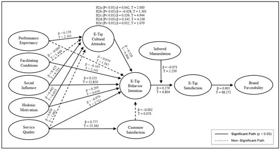 Social Influence (SI) had a strong, significant relationship with both Attitude toward E-tipping (ATT) (T-statistic = 8.755, p = 0.000) and Behavior Intention (BI) (T-statistic = 12.850, p = 0.000), reaffirming the dominant role of normative pressure in high-context cultures. Hedonic Motivation (HM) significantly predicted both ATT (T-statistic = 6.653, p = 0.000) and BI (T-statistic = 4.010, p = 0.000), demonstrating that enjoyment and experiential positivity act as powerful motivational triggers. Performance Expectancy (PE) positively influenced ATT (T-statistic = 2.161, p-value = 0.031) but did not significantly influence BI (T-statistic = 1.587, p-value = 0.113), indicating that usefulness influences cultural meaning but not behavioral likelihood directly. Facilitating Conditions (FC) significantly predicted BI (T-statistic = 2.141, p-value = 0.032) but not ATT (T-statistic = 1.444, p-value = 0.149), supporting the notion that infrastructure aids execution but not cultural positioning. Service Quality (SQ) demonstrated a significant direct effect on BI (T-statistic = 2.711, p-value = 0.007), as well as a very strong effect on Customer Satisfaction (CS) (T-statistic = 23.362, p-value = 0.000), but did not significantly influence ATT (T-statistic = 1.082, p-value = 0.279). ATT strongly predicted BI (T-statistic = 6.476, p = 0.000), BI predicted E-tip Satisfaction (ES) (T-statistic = 6.804, p-value = 0.000), and ES in turn strongly predicted Brand Favorability (BF) (T-statistic = 68.272, p-value = 0.000).