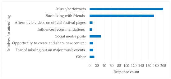 Among the motives for attending music festivals, music and performers (200 responses) and socializing with friends (175 responses) stand out the most. This demonstrates that the festival program and performers are key attractions, but also that music festivals are perceived as social and experiential events, not just musical ones. Responses related to social networks, such as aftermovie videos, influencer recommendations, content about music festivals on social media, or the opportunity to create and share new content, were not frequently chosen. Ten participants indicated that the fear of missing out (FOMO) on major music events is one of the most important motivating factors. FOMO (fear of missing out) is a psychological phenomenon describing an individual’s fear of missing important experiences, events, or content that others are attending. This feeling arises and intensifies under the influence of social networks, due to the constant comparison of one’s own life with the activities displayed by others (Montag & Markett, 2023) (Figure 4).