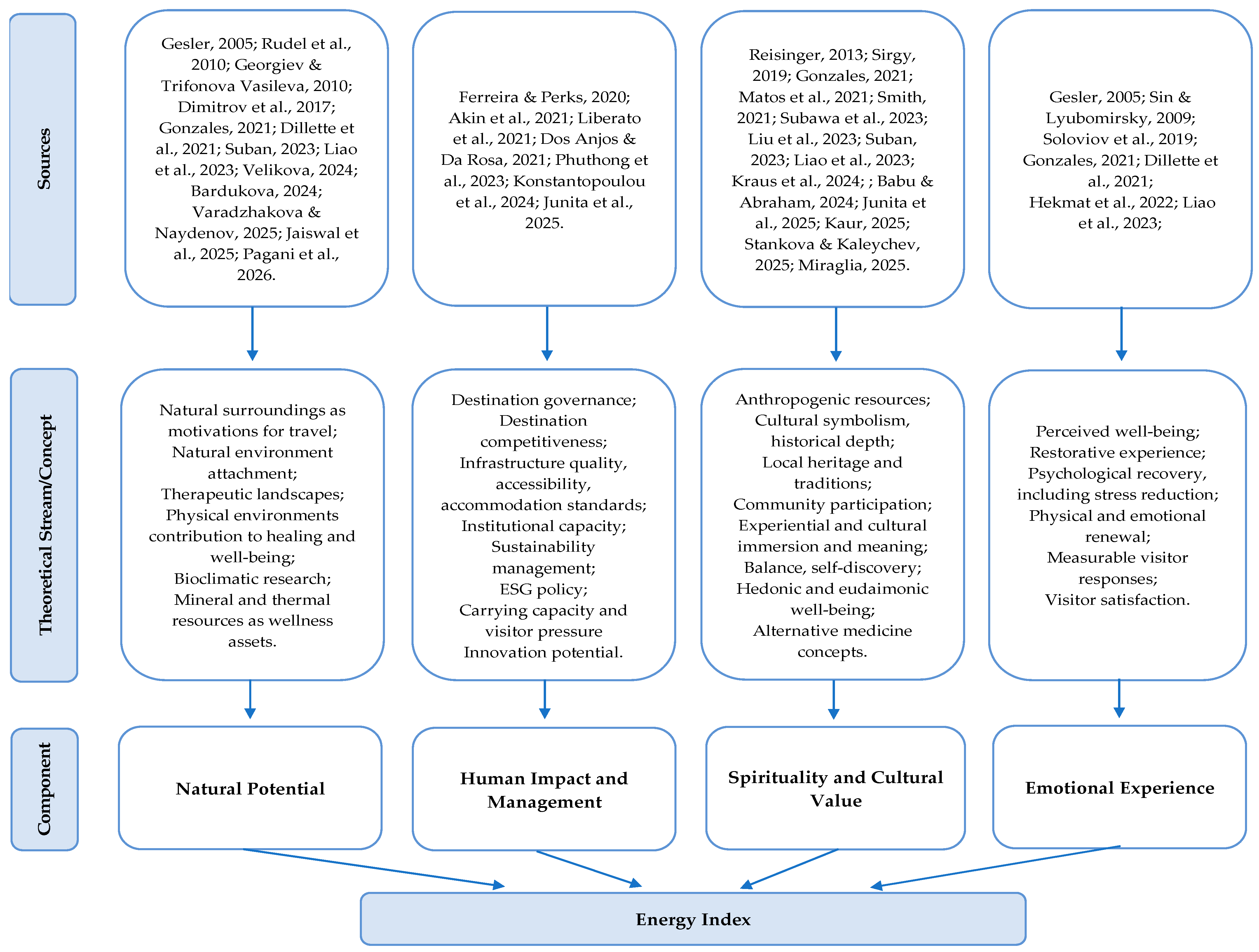 The present study proceeds from the understanding that the “energy” of a destination should not be interpreted as a metaphysical notion, but rather as a complex outcome of interactions among objective environmental characteristics, human impact, cultural and spiritual meanings, and subjective emotional responses. In this sense, “energy” is conceptualized as an analytical construct that captures how a destination is experienced and how it influences visitor well-being. It does not refer to a metaphysical or biophysical force but to a synthesized perception emerging from measurable environmental, managerial, cultural, and experiential attributes.