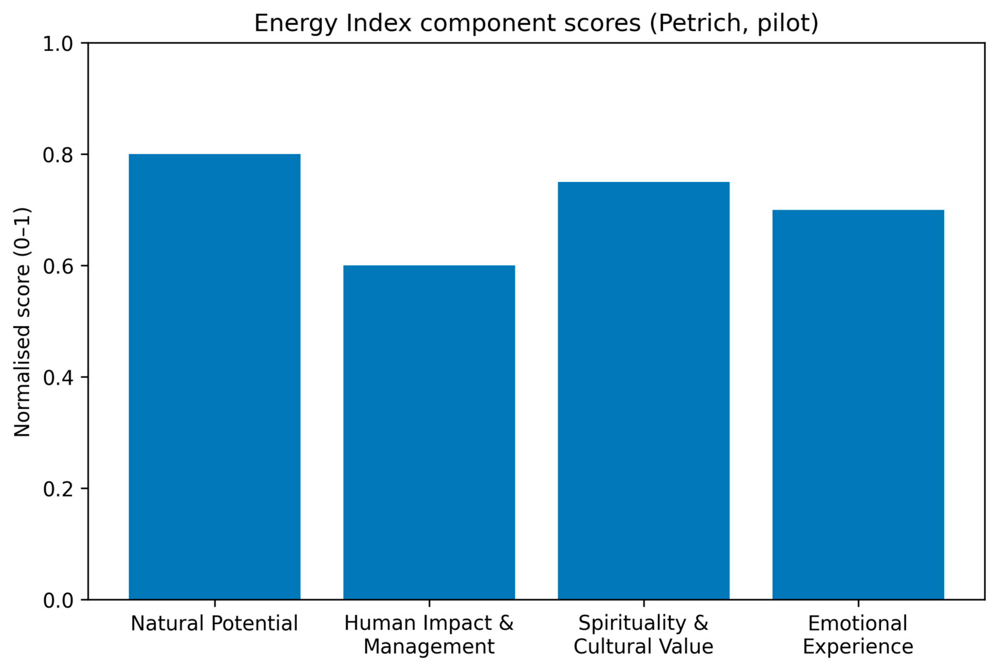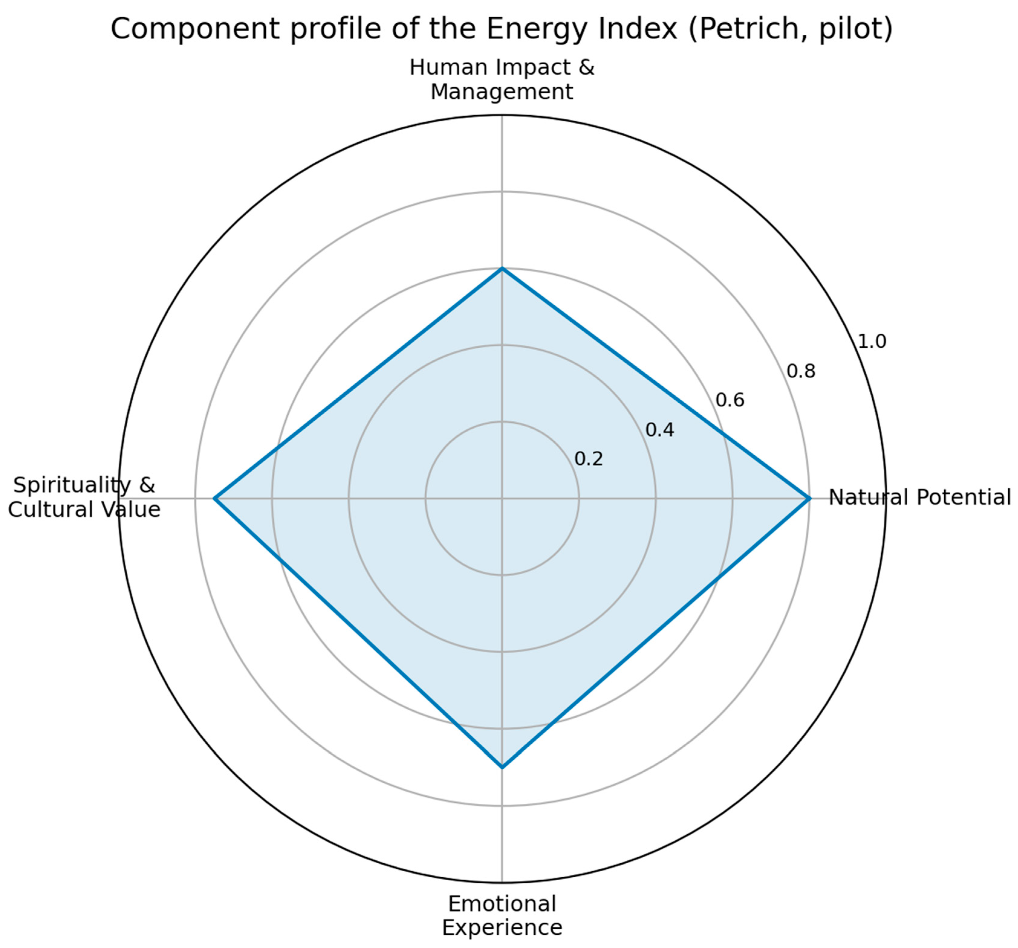 Babu & Abraham, 2024), which emphasizes that well-being outcomes are partly filtered through narrative, symbolism, and collective memory. In Petrich, the convergence of geothermal phenomena, spiritual symbolism associated with Baba Vanga, and archaeological heritage creates a multi-layered sense of place that reinforces perceived uniqueness. The analytical contribution of the Energy Index lies in making these intangible structuring factors visible within a measurable framework, without reducing them to purely subjective impressions.