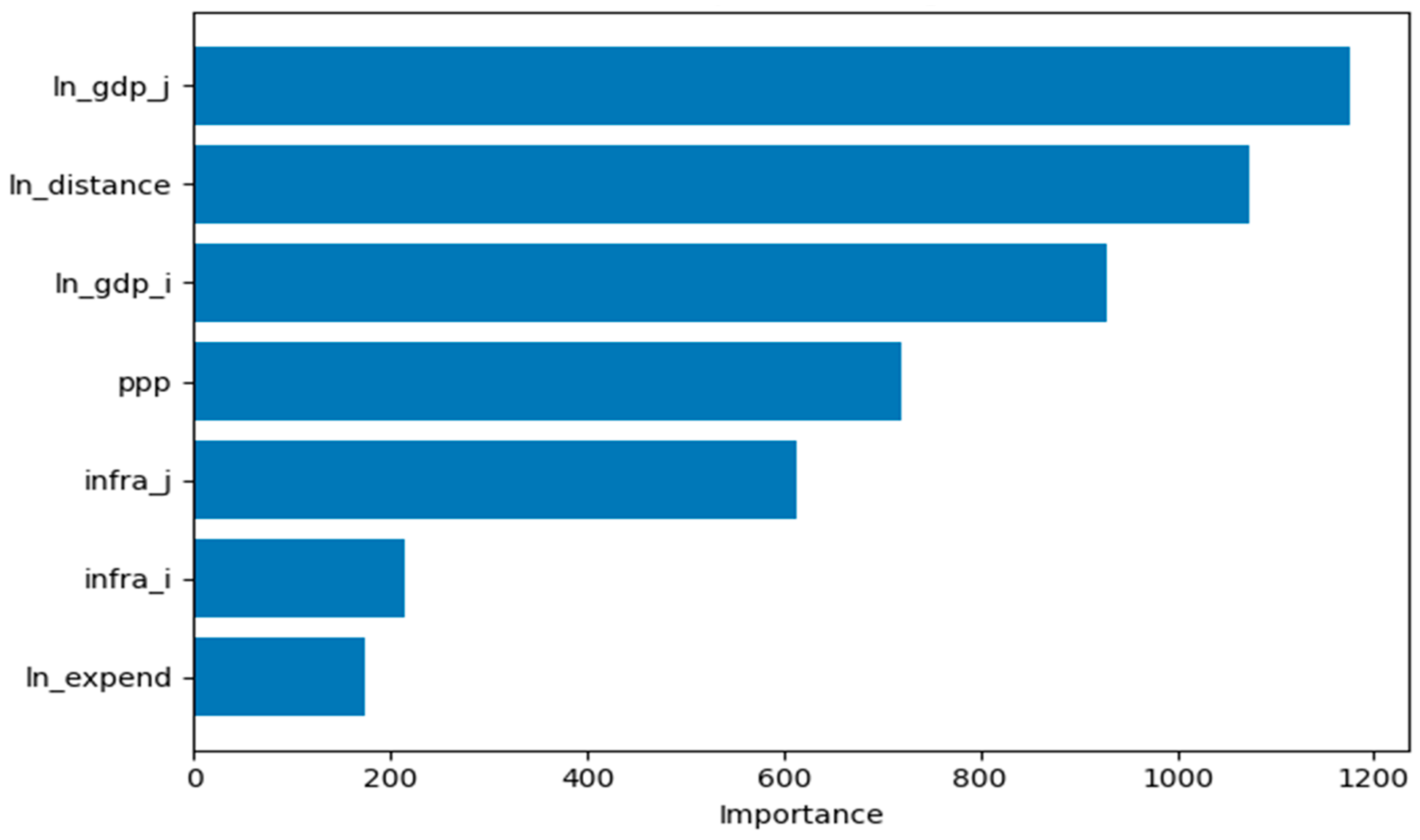 To improve the interpretability of the machine learning models, the SHAP (Shapley Additive Explanations) method was applied to assess each variable’s contribution to the model’s outputs. The SHAP approach is based on game theory and measures the contribution of a variable by comparing model outputs with and without that variable. The mean absolute SHAP value is commonly used to assess the global importance of variables. In the present study, SHAP values serve as sensitivity measures that complement the elasticity estimates derived from the gravity model: whereas the gravity elasticities quantify the average marginal effect of each variable under the assumption of log-linearity, the mean absolute SHAP values reflect each variable’s average contribution to the machine learning model’s output across all observations, without imposing any functional form restriction. The relative importance of variables derived from the LightGBM model is illustrated in