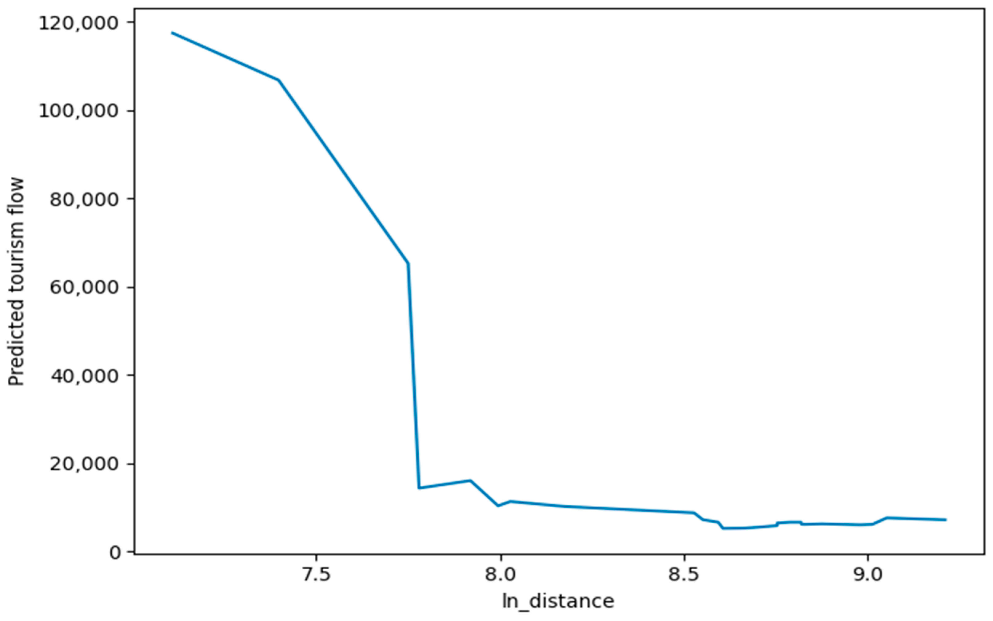 To illustrate the effect of distance more clearly, a partial dependence analysis derived from the machine learning model was used to visualize the relationship between distance and fitted tourism flows. The results are shown in