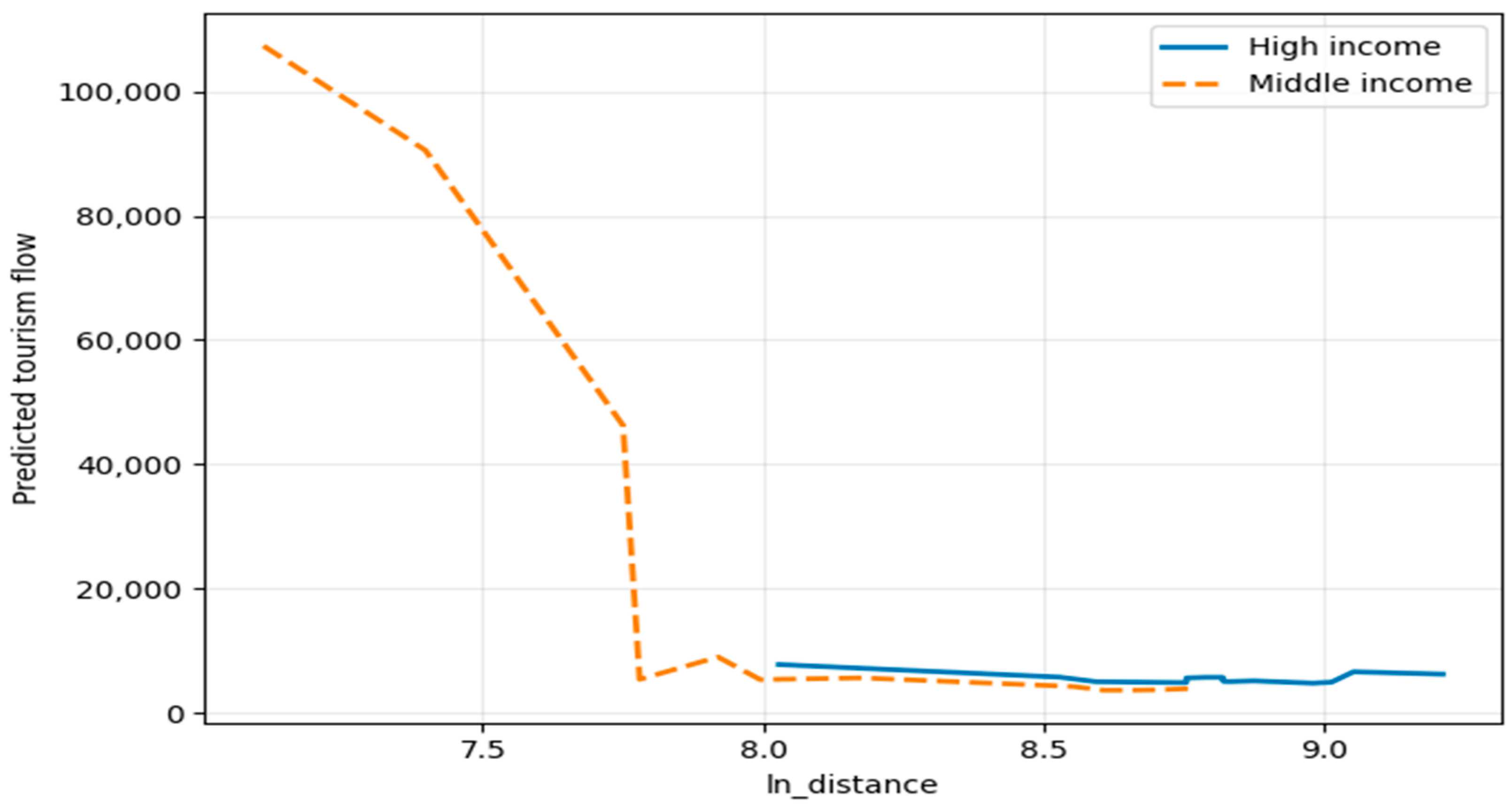 To account for economic differences across origin countries, the effect of distance on tourism flows was further examined by income level. Origin countries were classified into two groups: high-income and middle-income economies, following the World Bank income classification applied to the sample period. The influence of distance was then evaluated using a machine-learning-based partial dependence approach. This method illustrates the relationship between distance and fitted tourism flows while holding other variables at their average levels. By stratifying the partial dependence profiles by income group, the analysis examines whether the distance-decay relationship documented in