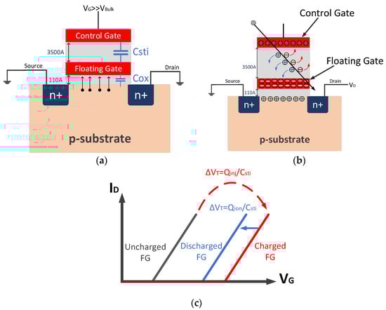 The operation principle to sense radiation using Floating Gate (FG) transistor is to first pre-charge the FG using Fowler–Nordheim (FN) Tunneling by applying a large enough electric field on the FG itself [6]. Once the FG is charged, an alpha particle incident will generate e–h pairs that will be separated by an applied electrical field and will discharge the FG [7]. Considering the fact that the threshold voltage of the device is proportional to the charge within the FG as described by Equation (1), an alpha incident will shift the device’s threshold voltage as illustrated in Figure 1.