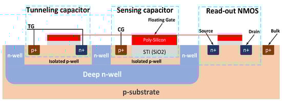 Fabricating an FG transistor in standard CMOS process with a single polysilicon layer was done in the mature, well-proven TowerJazz High Voltage standard 180 nm CMOS Process [10]. TowerJazz had been developing Floating-Gate technology for memory devices, which had been later further developed and extended for direct sensing of radiation and dubbed C-cell. This technology and its reliability have been documented in the open literature [11,12,13,14,15,16]. The essence of this technology is shown in Figure 3.