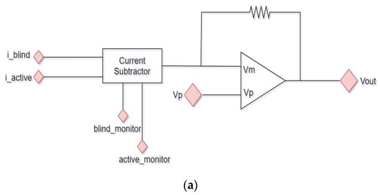 An incident alpha particle on the active sensors array will increase current as shown in Equation (5). Subtracting the blind array’s current from the active array’s current provides a differential measurement. Hence, the readout circuit was designed as a precise current subtractor followed by a Trans Impedance Amplifier (TIA), to convert the output signal into output voltage (see Figure 6). The difference between two adjacent samples of the readout voltage, meaning the output voltage derivative, reflects the amount of alpha particles incidents.