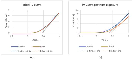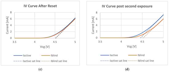Blind and Active arrays IV curve. (a) Initial IV curve. (b) post 6 min exposure IV curve. (c) IV curve after reset. (d) post second 6 min exposure.