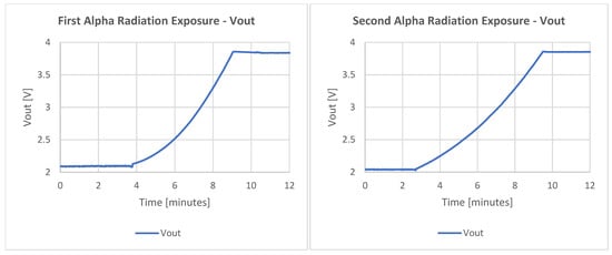 To characterize the device response to alpha particles radiation, the device was exposed to an alpha source, Po-210, with an alpha emission rate of 925 Bq for two periods of 6 min, with a reset stage before each exposure.