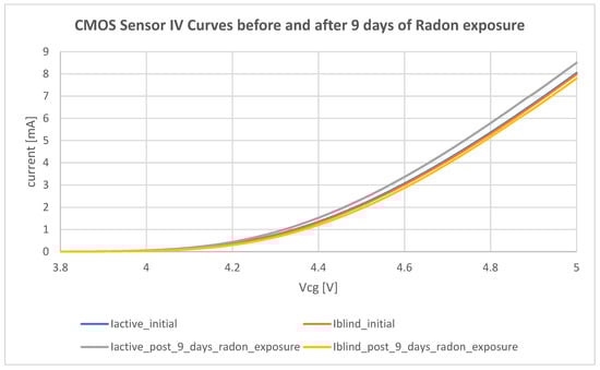 IV curve of blind and active arrays, before and after 9 days of Radon exposure.