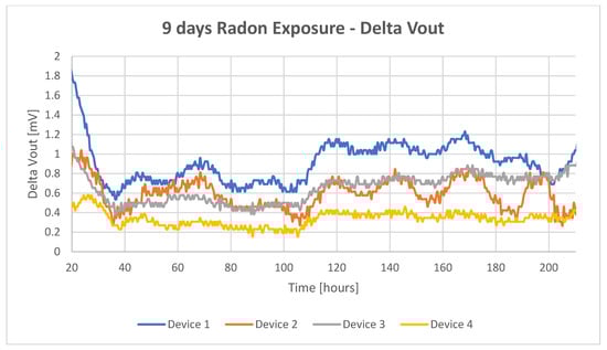Figure 10 presents 27 mV threshold voltage shift after 9 days of radon exposure for a single sensor, while Figure 11 presents the readout circuit derivative of all instances, which represents the voltage difference between two measures caused by alpha particles incident on the active detector. All instances present the same trend, while the distribution of the results reflects each sensor’s sensitivity, which is configured by the sensor’s bias current.