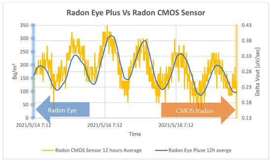 Figure 12 shows the comparison between commercial radon sensors to the proposed CMOS sensor. In order to convert the readout voltage into radon concentration, a calibration factor is suggested: