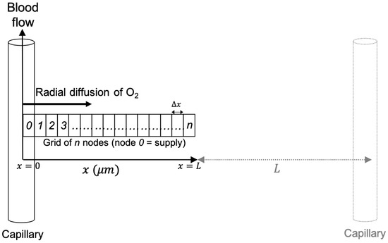 Schematic diagram of the oxygen diffusion-reaction model, showing radial diffusion from a capillary along an orthogonal grid of nodes. An adjacent capillary is shown, where the distance between two capillaries is . A node width of 1 and system length of 50 was used for all simulations. The figure is reproduced from Rothwell et al. [19].
