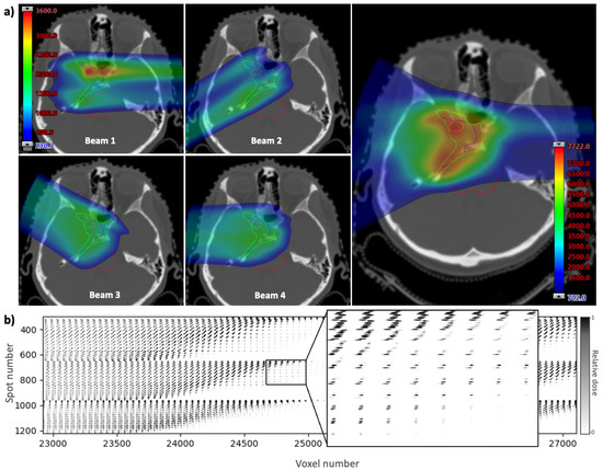 (a) A clinical base of skull treatment plan showing the contribution of dose from four beams (left) and the full dose map (right) overlayed onto a CT slice. Dose distributions are generated using Eclipse (Varian Medical Systems, Palo Alto, CA, USA). (b) Extract from the corresponding influence matrix showing the contribution of each spot to each voxel in the treatment volume. Each voxel in the three-dimensional treatment plan is reshaped into a one-dimensional list by assigning a number (in order of increasing z, then by increasing x, then by increasing y) to form the columns of the influence matrix. The list of spots, in the order they are delivered, make up the rows.