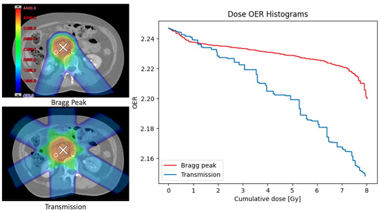 Non-clinical dose distributions (left) generated to deliver 8 Gy per fraction to the same abdominal treatment site using either multiple layers of Bragg peaks (top left) or 245 MeV transmission beams (bottom left). Example dose-OER histograms (right) were calculated for a single point in the PTV of both plans, to show the OER as as a function of cumulative dose at that point. The area under the OER curve gives an indication of the overall decrease in radiosensitivity during the plan. Results were generated for the node 25 from the capillary.