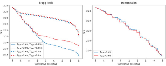 Dose-OER histograms calculated for a single point in the PTV of the Bragg peak (left) and transmission (right) plans shown in Figure 4, using different values of the time taken to scan between consecutive spots, T, and the time taken to change the energy layer, T. Different layer change times were not simulated for the single-layer transmission plan. Results were generated for the node 25 from the capillary.