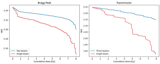 Dose-OER histograms calculated for a single point in the PTV of the Bragg peak (left) and transmission (right) plans shown in Figure 4, using either the original number of beams (two for the Bragg peak plan, three for the transmission plan), or a single beam from the plan delivering the full 8 Gy dose per fraction. Results were generated for the node 25 from the capillary.