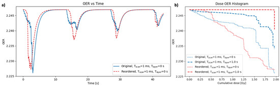 Various re-delivery strategies were tested using this model to investigate the effects of delivering the same set of spots (and therefore the same dose distribution) in a different order. The results in Figure 7 show an example case of reordering the delivery of the spots used in the clinical base of skull plan. The original order was the default delivery generated by the delivery system (scanning row-by-row in the x-y plane for a single layer, then changing the energy layer and scanning row-by-row again in the next). The method of reordering tested here was to order all of the spots row-by-row in the x-y plane across all energy layers (within each beam), such that energy changes were introduced between consecutive spots. Both orders were tested for layer change times of 0 and 1 s, while keeping the scan time between spots constant at 1 ms. The results in Figure 7 were generated for a point in the GTV of the plan, and for the node 25 from the capillary. Figure 7a shows the change in OER over the course of the treatment for both delivery orders, using a layer change time of 0 s. Figure 7b shows dose-OER histogram results for each of the layer change times tested, for both orders of delivery.