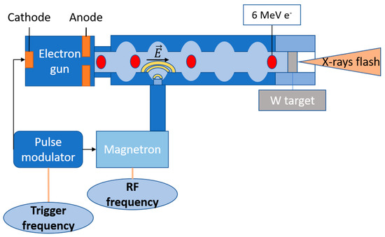This irradiation campaign was performed at the ORIATRON facility of CEA at Gramat in France [38,39]. This irradiator is a pulsed radiofrequency (RF) electron source, illustrated in Figure 1.