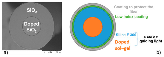 The tested Ce-doped optical fiber was developed by the technological platform FiberTech Lille of the PhLAM laboratory, France. First, a cerium-doped silica glass rod was fabricated using the sol–gel method, as described in [46]. The obtained glassy rod was drawn down to millimeter-sized canes. After etching with HF and sleeving into F300 silica tube, a final drawing leads to an optical fiber with a diameter of about 125 µm, within which the Ce-doped core zone has a diameter of about 50 µm. The fiber structure is illustrated by the SEM transverse cross-section image presented in Figure 3a. As the cerium doping does not sufficiently change the refractive index of the silica to ensure the light guidance, a 30 µm thick low-refractive index coating was added for this purpose. To protect the optical fiber, an external coating was adjusted with a larger diameter of 340 µm. The whole fiber structure is schematically illustrated in Figure 3b.