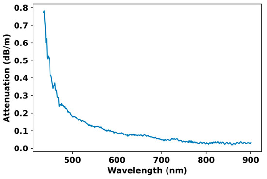 The cutback method was applied to measure the background optical losses of the Ce-doped optical fiber (Figure 4) before irradiation. To this end, a supercontinuum source and an optical spectrum analyzer (OSA) were used. In the zone characteristic of RL emission band of Ce3+ ions, around 470 nm [35], this fiber presented a loss value of about 0.24 dB/m. Our OSA did not allow attenuation measurements for wavelengths below 435 nm. Despite this, the increase in the loss level, observed in the short wavelength region, could be associated with the presence of the characteristic absorption bands of Ce3+ ions around 320 nm [46].