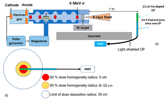 The experimental setup is illustrated in Figure 5. Signal detection was recorded with a photomultiplier tube (Hamamatsu H7421-40) [47]. At the beam focal point, which is defined as the area where the dose rate is the highest and corresponding to the center of the irradiator window, at 1 m away from the tungsten target, the dose per pulse reached 6.7 × 10−4 Gy(SiO2). At 195 Hz, the dose rate measured at 1 m from the source as schemed in Figure 5a was 130.44 ± 2.22 mGy(SiO2)/s which was divided to calculate the dose per pulse. The homogeneity at 90% of the dose (i.e., 6.1 × 10−4 Gy(SiO2) per pulse) was reached on a 5 cm radius circle transverse to the beam propagation, as represented in Figure 5b. This homogeneity decreased with increasing radius. The area corresponding to 80% of the maximum dose (i.e., 5.4 × 10−4 Gy(SiO2) per pulse) is defined by an 8–10 cm radius circle. Finally, the dose per pulse is considered as negligible for a radius larger than 25 cm. Considering this dose homogeneity evolution, the 11 cm long sample was centered in the 90% area. Then the radiation-hardened fiber was used to exit from the irradiated area. A 25 cm length of this fiber was exposed to a dose evolving between almost zero to 90% of the maximum dose. For each set of pulses, the PMT integrated photons during a user-defined gate time ranging from 50 µs to 10 s. To track pulses, we chose to vary the gate time between 50 µs and 1 ms. When the bunch frequency was too low for a given acquisition gate or the irradiation delay was longer than 5 s, the integration time was adjusted accordingly.