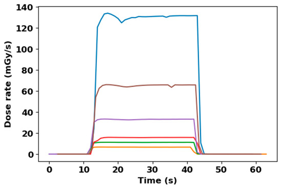 After this series of experiments, the sensitive part of the setup, the Ce-doped fiber was removed to keep only the RHF fiber, and the same measurements were repeated. The aim of this second experiment was to measure the RIE coming from the sole transport line. We could reconstruct the response originating only from the Ce-doped sensitive probe by subtracting the parasitic RIE from the luminescence level measured in the complete sensing probe. The dose rates delivered by the accelerator were calibrated using the PTW farmer probe (PTW Farmer 30013 [40]) from the maximum dose rate available delivered at 195 Hz with a pulse duration of 4.8 µs. Then, the dose rates used in these experiments were defined by decreasing progressively the production rate down to 25 Hz. The two lower dose rates were obtained with 25 Hz, and dividing by 2 and 4, the pulse duration from 4.8 µs to 2.4 and finally 1.1 µs. All the dose rates used in these experiments are reported in the Figure 6.