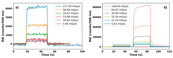 Accordingly, a limit for the highest dose rate is defined when the RHF is the sole radiation sensor present, shown as the purple line in Figure 10a. With such detection setup and this sensor design, the upper limit of the range of dose rates would be between a 10−1 mGy(SiO2)/s and 10 Gy(SiO2)/s for RIE integrated on 500 ms.